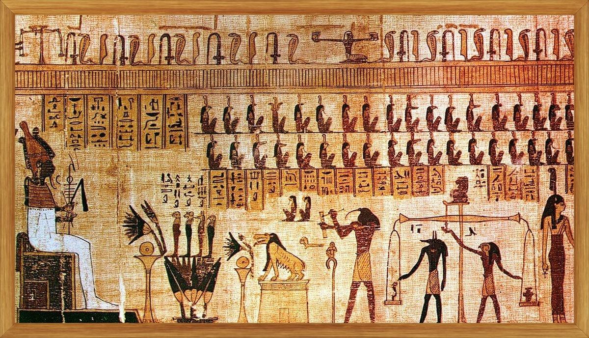 ANUBIS, representado con cuerpo de hombre y cabeza de chacal o lobo emplumado, símbolo de la justicia divina, de la suprema piedad y de la suprema impiedad de la ley. ANUBIS es auxiliado por 42 jueces asesores y es el encargado de premiar y castigar a los hombres y pueblos de acuerdo a sus obras.